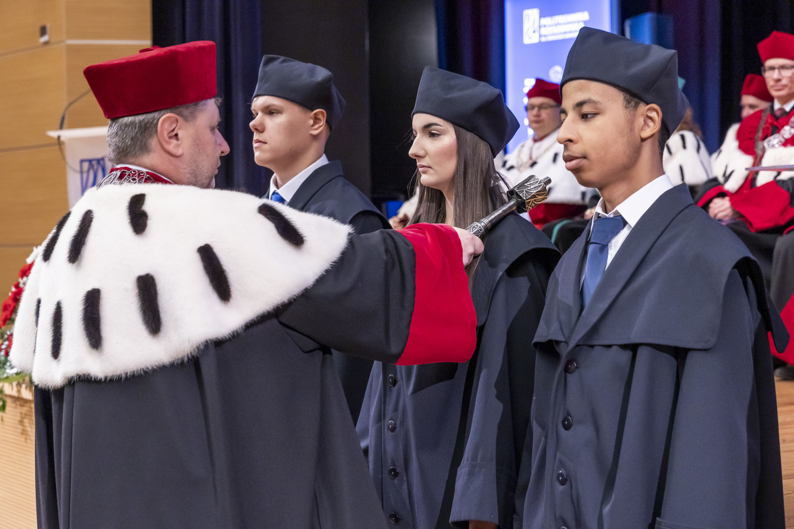 Ważną częścią uroczystości było ślubowanie przedstawicieli studentek i studentów pierwszego roku, które poprowadziła prorektor ds. kształcenia dr hab. Iwona Włoch, prof. PRz, oraz przedstawicieli doktorantek i doktorantów Szkoły Doktorskiej Politechniki Rzeszowskiej, które poprowadził prorektor ds. nauki dr hab. inż. Lesław Gniewek, prof. PRz. JM Rektor dokonał pasowania studentek i studentów oraz doktorantek i doktorantów.