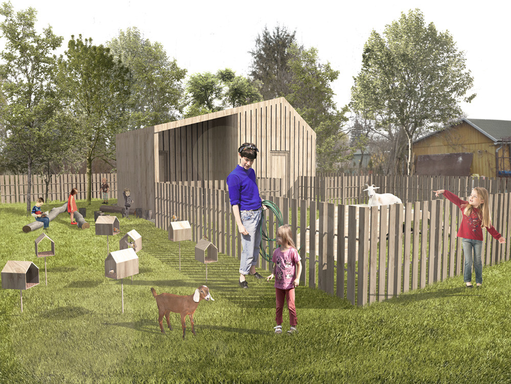 Przedszkole zaprojektowane zostało jako szereg oddzielnych budynków o rożnych funkcjach zlokalizowanych na czterech osobnych działkach w obrębie ogródków działkowych. Na pierwszej działce znalazł się budynek administracyjny z salą zabaw dla dzieci i poczekalnią dla rodziców. Na kolejnej główny budynek przedszkola z jednoprzestrzennym układem wnętrz, którego sercem stała się dziecięca kuchnia. Trzecia działka to miejsce na małą oborę dla kóz. W ostatniej lokalizacji znajduje się plac zabaw wykorzystujący naturalne ukształtowanie terenu oraz istniejąca zieleń.