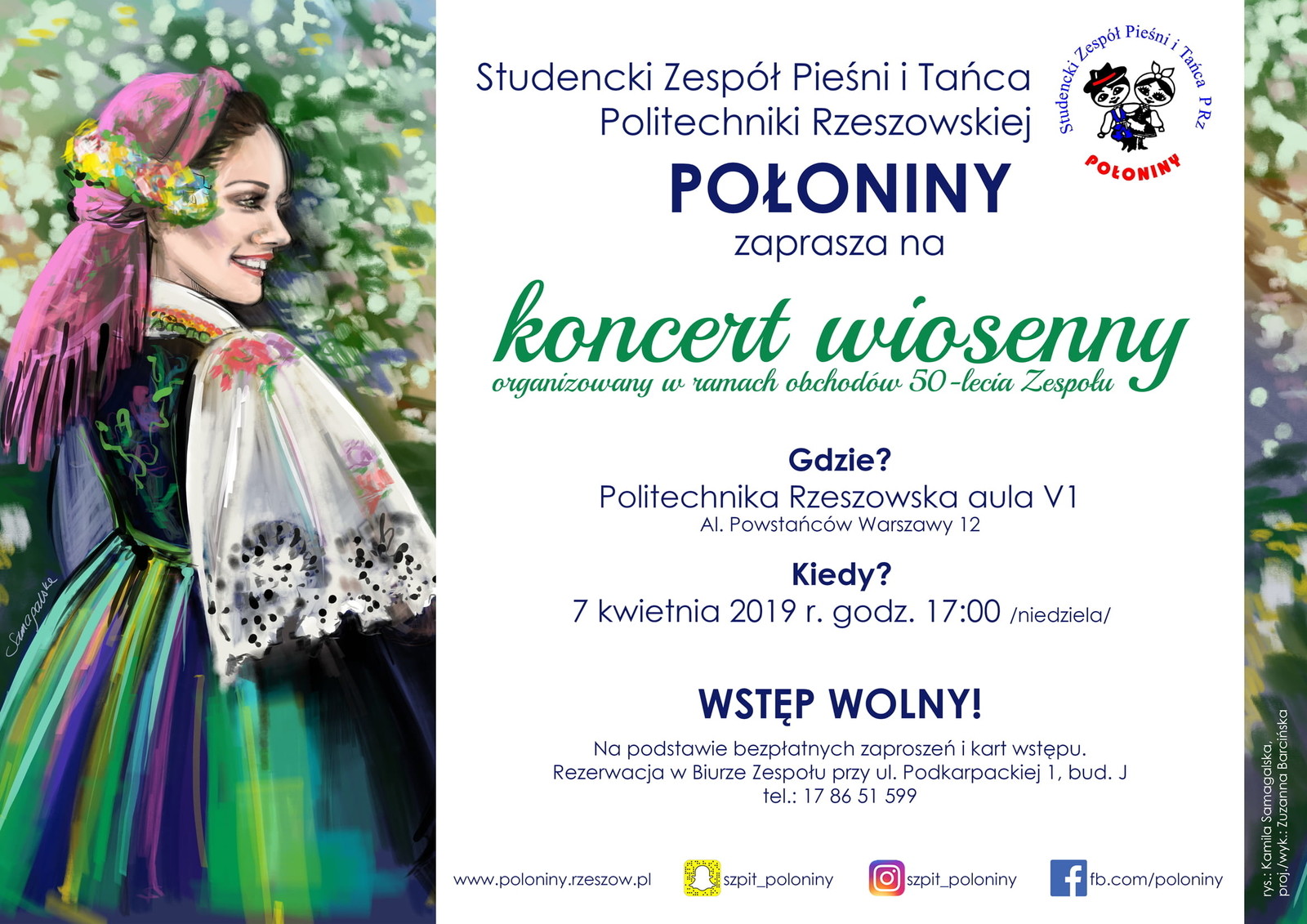 Studencki Zespół Pieśni i Tańca Politechniki Rzeszowskiej „POŁONINY" serdecznie zaprasza na koncert wiosenny, który odbędzie się 7 kwietnia 2019 r. o godz. 17:00 w auli V-1 Politechniki Rzeszowskiej przy ul. Powstańców Warszawy 12.