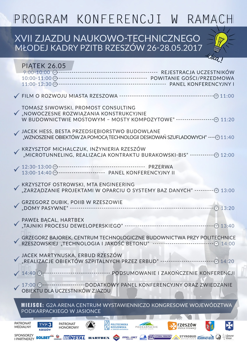 Od 26 do 27 maja br. w auli V-1 odbywać się będzie XVII Krajowy Zjazd Naukowo-Techniczny Młodej Kadry PZITB w Rzeszowie, w ramach którego zostanie przeprowadzona konferencja „Rzeszowskie innowacje”. Organizują ją studenci WBIŚiA zrzeszeni w Kole Młodych Polskiego Związku Inżynierów i Techników Budownictwa. W programie sesji przewidziano m.in.: film o rozwoju Rzeszowa, dwa panele eksperckie, wystąpienia przedstawicieli rzeszowskich firm budowlanych oraz konkurs z nagrodami. Więcej szczegółów na poniższym plakacie.