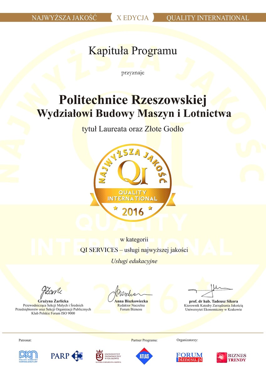 Kapituła X edycji programu, realizowanego pod patronatem Polskiej Agencji Rozwoju Przedsiębiorczości, Polskiego Komitetu Normalizacyjnego oraz Klubu Polskiego Forum ISO 9000, wysoko oceniła zgłoszenie i nagrodziła działania związane z usługami świadczonymi przez Wydział Budowy Maszyn i Lotnictwa Politechniki Rzeszowskiej.